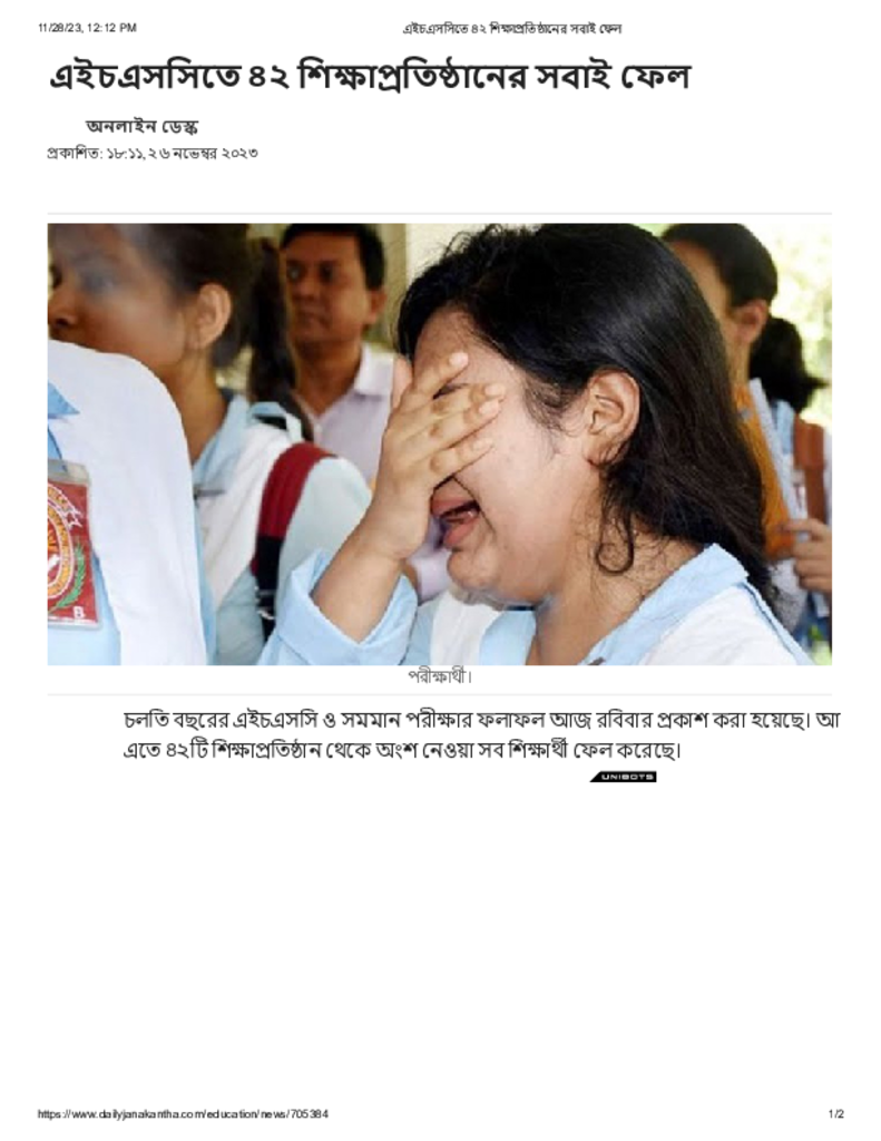 এইচএসসিতে ৪২ শিক্ষাপ্রতিষ্ঠানের সবাই ফেল