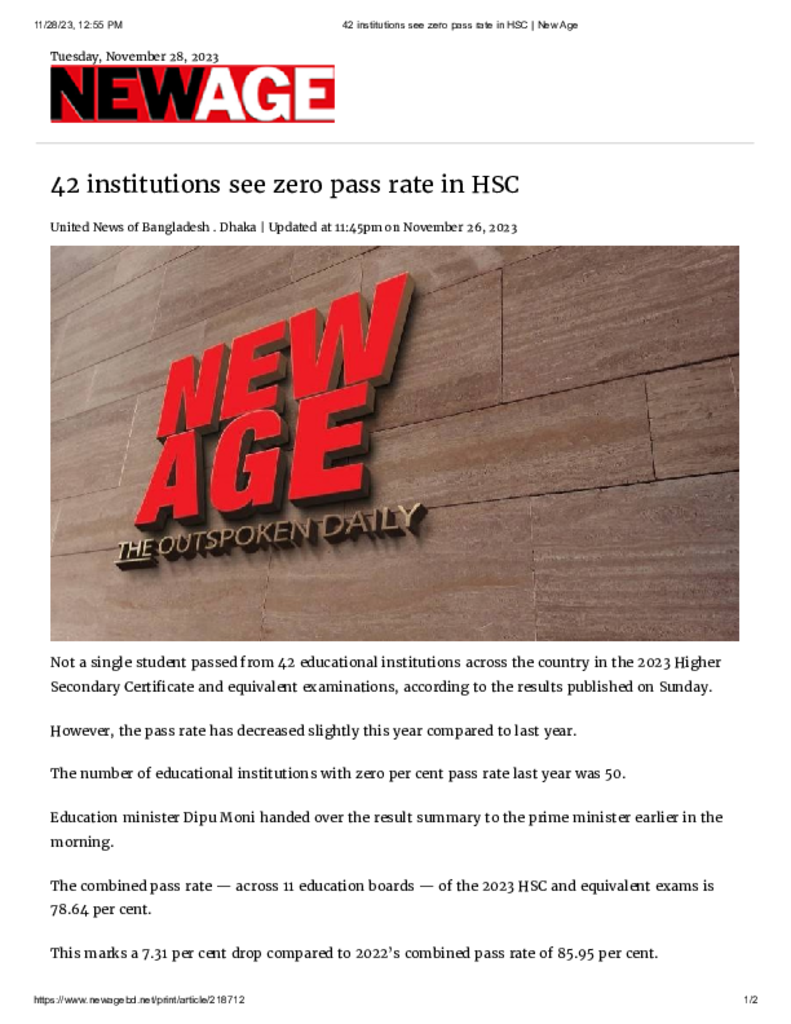 42 institutions see zero pass rate in HSC _ New Age Published on 26 November 2023 Newspaper New Age Category Public Examination Public Examination HSC Download