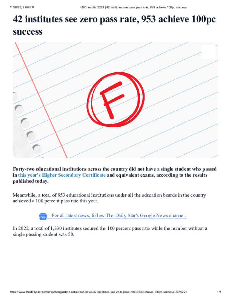 HSC results 2023 _ 42 institutes see zero pass rate, 953 achieve 100pc success