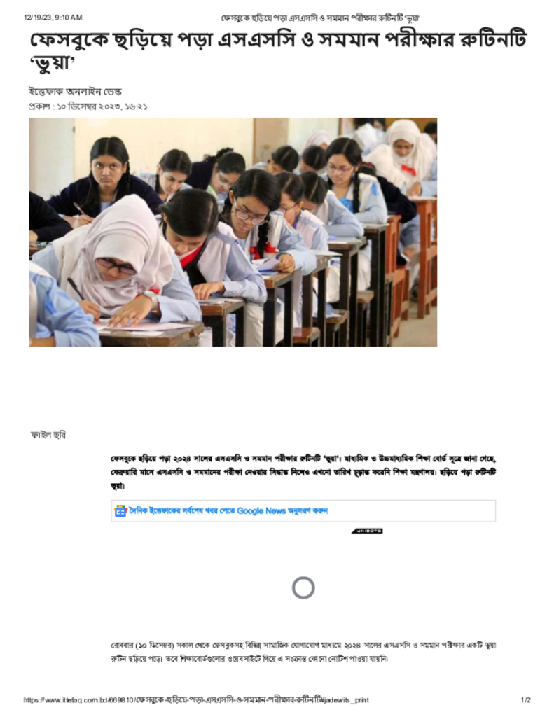 ফেসবুকে ছড়িয়ে পড়া এসএসসি ও সমমান পরীক্ষার রুটিনটি ‘ভুয়া’ Published on 10 December 2023 Newspaper দৈনিক ইত্তেফাক Category Public Examination Public Examination SSC Download