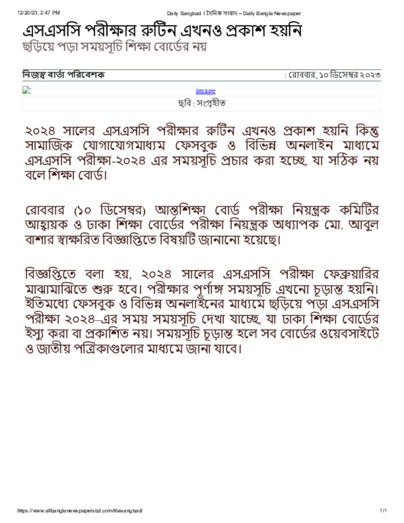 এসএসসি পরীক্ষার রুটিন এখনও প্রকাশ হয়নি Published on 10 December 2023 Newspaper দৈনিক সংবাদ Category Educational Ministry / Departments Public Examination SSC Download