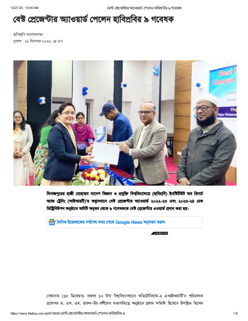 বেস্ট প্রেজেন্টার অ্যাওয়ার্ড পেলেন হাবিপ্রবির ৯ গবেষক Published on 19 December 2023 Newspaper দৈনিক ইত্তেফাক Category Professional Education General Education Download