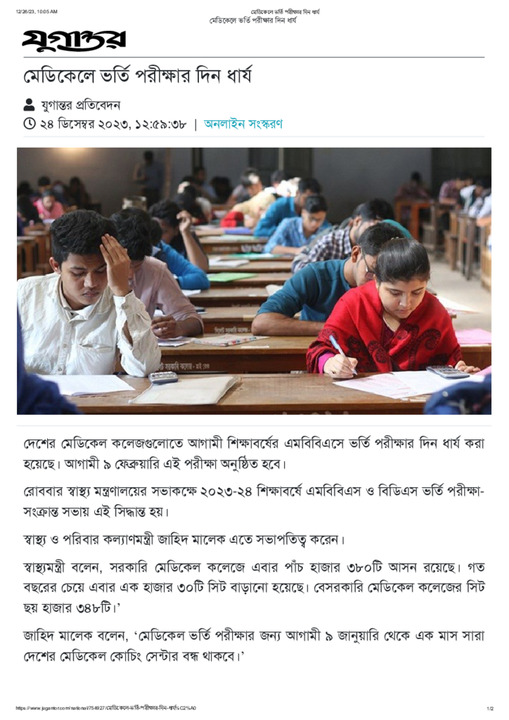 মেডিকেলে ভর্তি পরীক্ষার দিন ধার্য Published on 24 December 2023 Newspaper দৈনিক যুগান্তর Category Professional Education Professional Education Medical Download