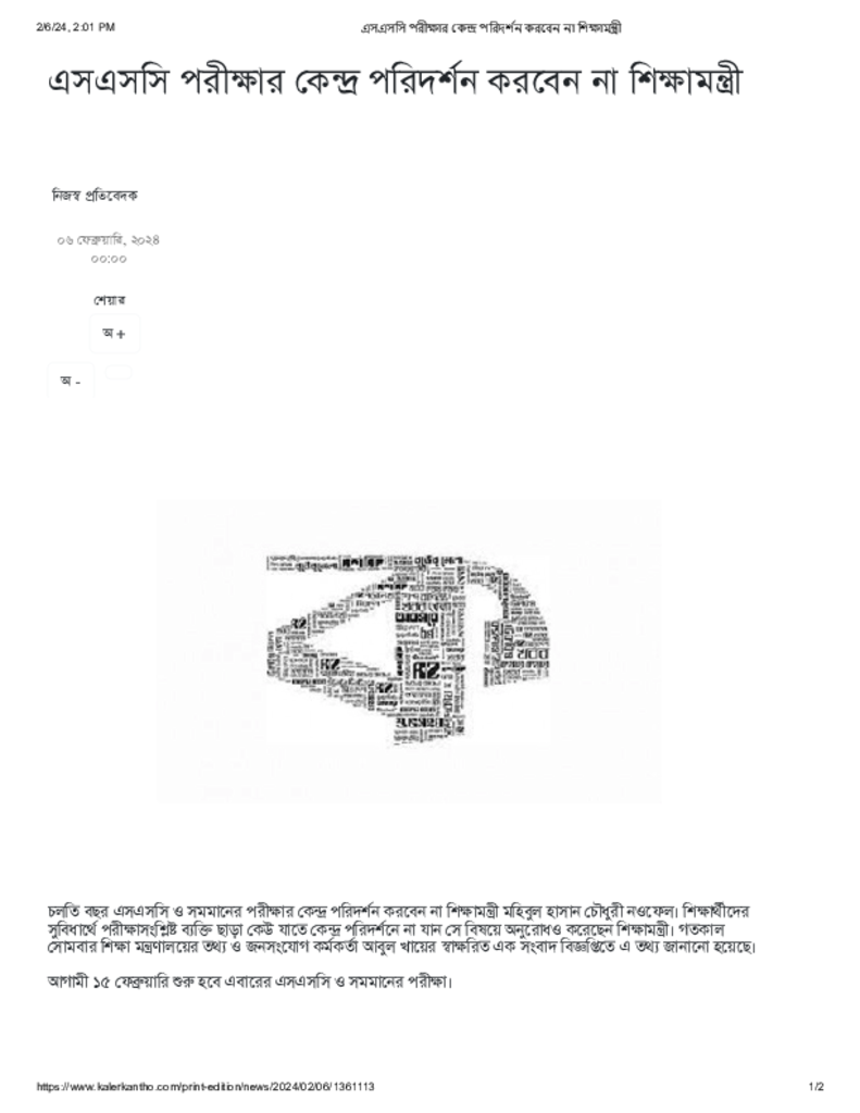 এসএসসি পরীক্ষার কেন্দ্র পরিদর্শন করবেন না শিক্ষামন্ত্রী Published on 06 February 2024 Newspaper দৈনিক সংবাদ Category Educational Ministry / Departments Public Examination SSC Download