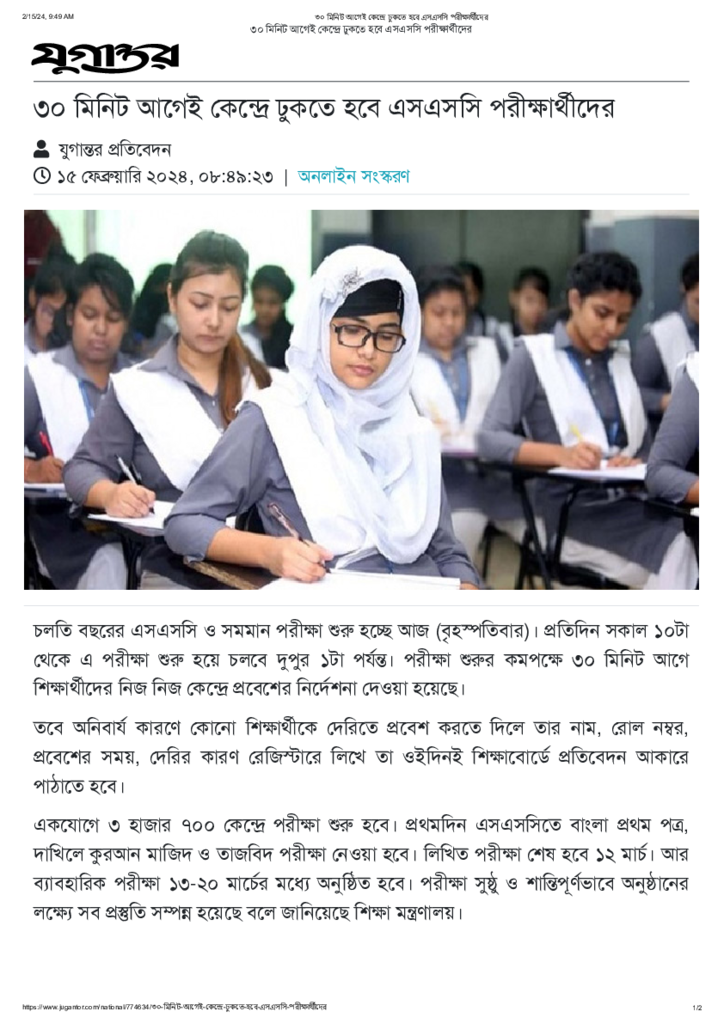 ৩০ মিনিট আগেই কেন্দ্রে ঢুকতে হবে এসএসসি পরীক্ষার্থীদের Published on 15 February 2024 Newspaper দৈনিক যুগান্তর Category Educational Ministry / Departments Public Examination SSC Download