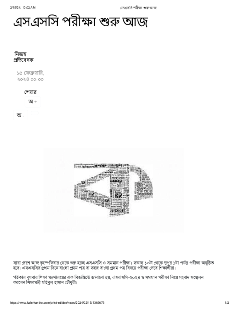 এসএসসি পরীক্ষা শুরু আজ Published on 15 February 2024 Newspaper দৈনিক কালের কন্ঠ Category Public Examination Public Examination SSC Download