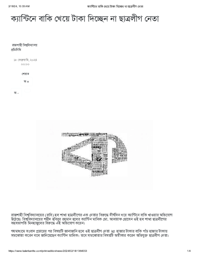 ক্যান্টিনে বাকি খেয়ে টাকা দিচ্ছেন না ছাত্রলীগ নেতা Published on 18 February 2024 Newspaper দৈনিক কালের কন্ঠ Category Campus Terrorism General Education Download