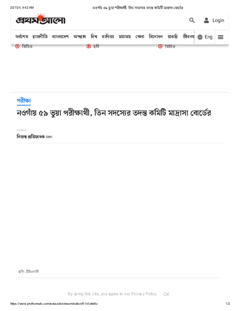 নওগাঁয় ৫৯ ভুয়া পরীক্ষার্থী, তিন সদস্যের তদন্ত কমিটি মাদ্রাসা বোর্ডের Published on 21 February 2024 Newspaper দৈনিক প্রথম আলো Category Public Examination Public Examination SSC Download