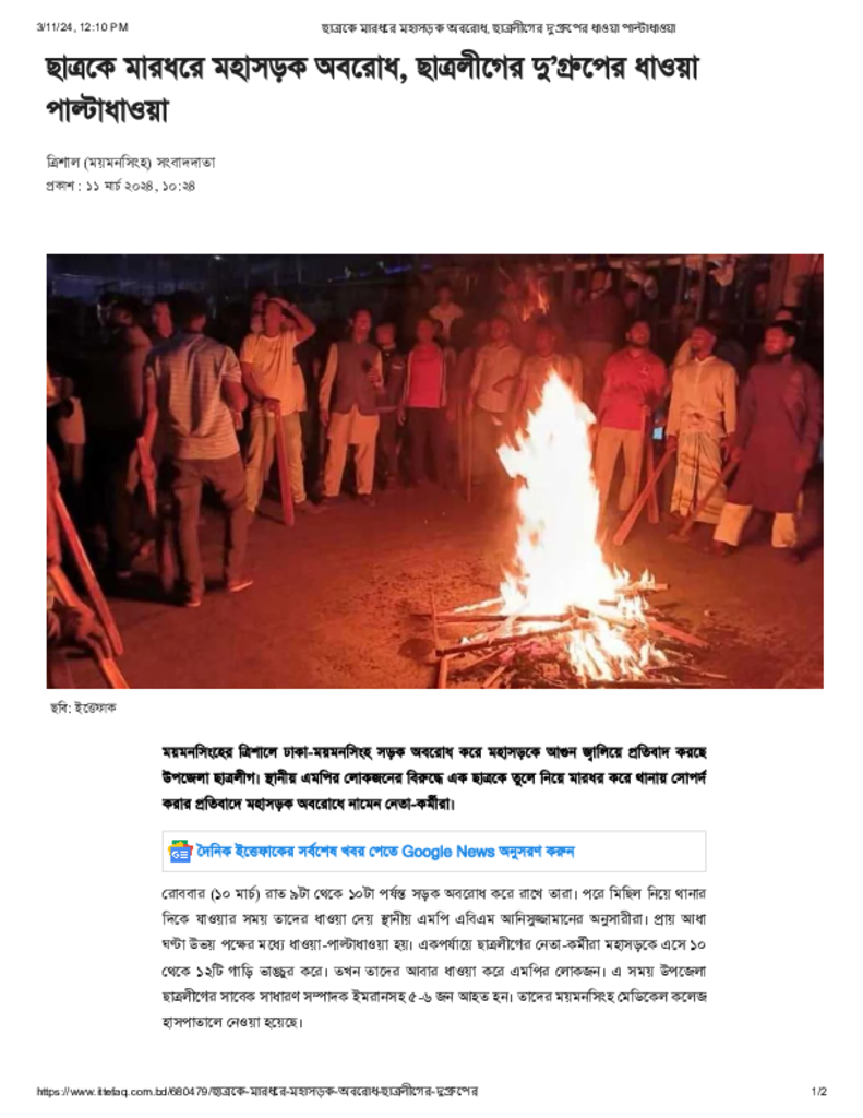 ছাত্রকে মারধরে মহাসড়ক অবরোধ, ছাত্রলীগের দু’গ্রুপের ধাওয়া পাল্টাধাওয়া Published on 11 March 2024 Newspaper দৈনিক ইত্তেফাক Category Campus Terrorism General Education Download