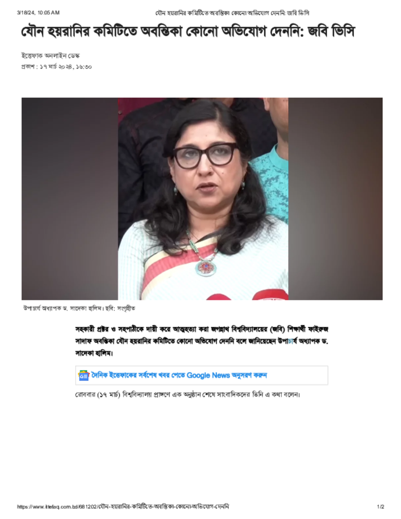 যৌন হয়রানির কমিটিতে অবন্তিকা কোনো অভিযোগ দেননি_ জবি ভিসি Published on 17 March 2024 Newspaper দৈনিক ইত্তেফাক Category Campus Terrorism General Education Download