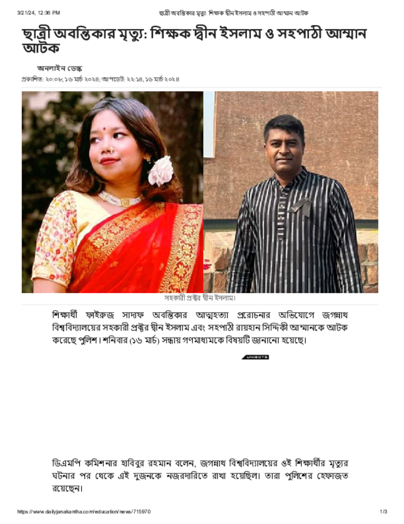 ছাত্রী অবন্তিকার মৃত্যু_ শিক্ষক দ্বীন ইসলাম ও সহপাঠী আম্মান আটক Published on 17 March 2024 Newspaper দৈনিক জনকণ্ঠ Category Campus Terrorism General Education Download