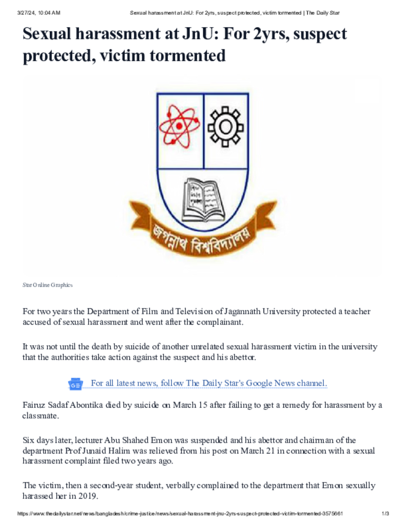 Sexual harassment at JnU_ For 2yrs, suspect protected, victim tormented _ The Daily Star Published on 27 March 2024 Newspaper The Daily Star Category Campus Terrorism General Education Download