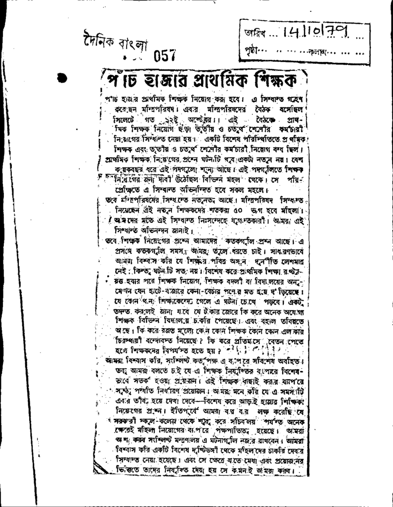 পাচঁ হাজার প্রাথমিক শিক্ষক নিয়োগের সিদ্ধান্ত অর্ধক মহিলা
