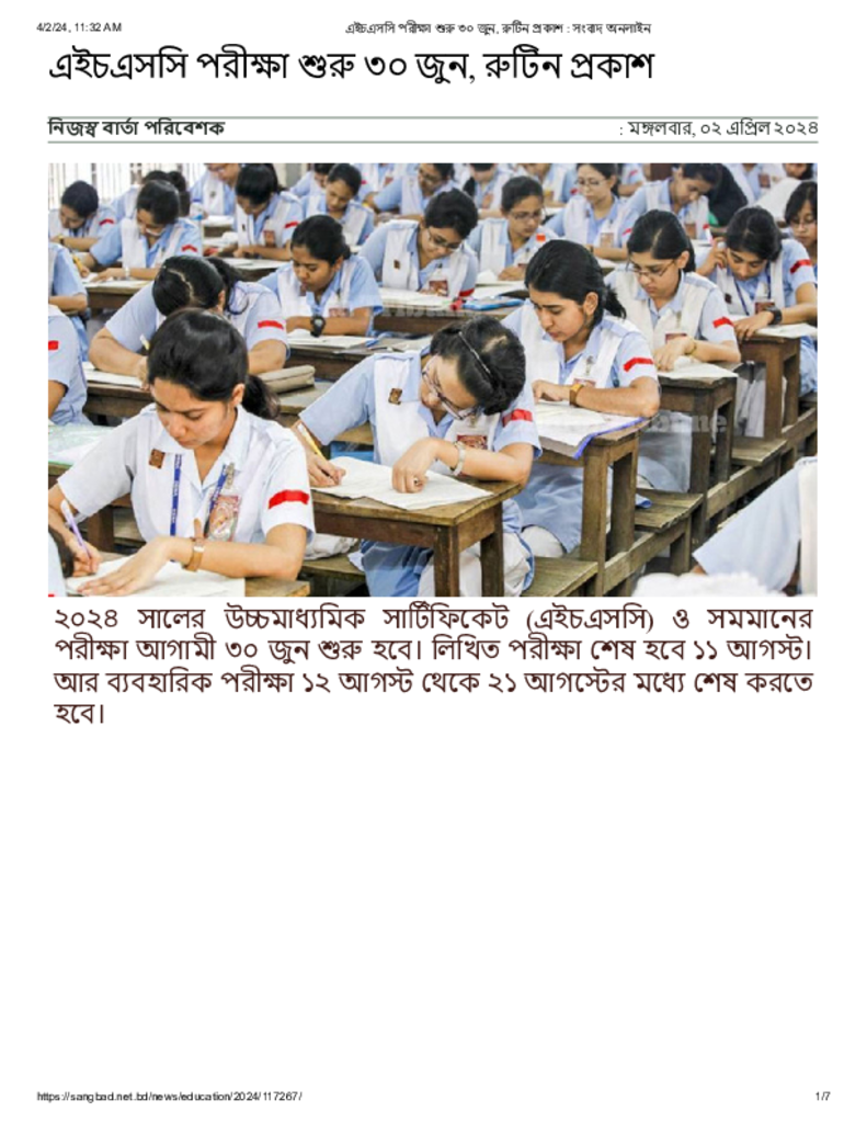 এইচএসসি পরীক্ষা শুরু ৩০ জুন, রুটিন প্রকাশ _ সংবাদ অনলাইন Published on 02 April 2024 Newspaper দৈনিক কালের কন্ঠ Category Public Examination Public Examination HSC Download