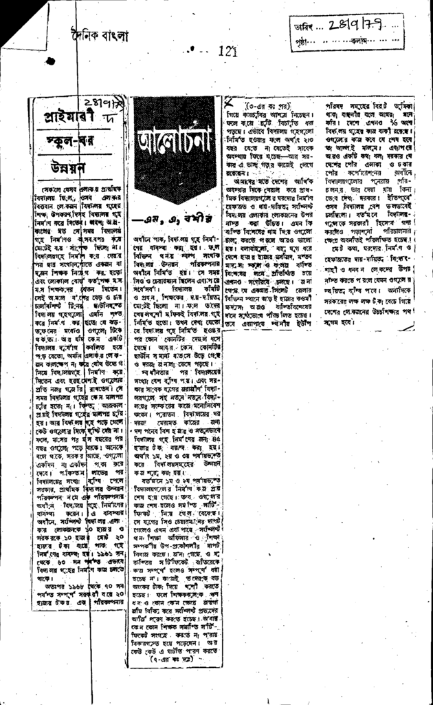 প্রাইমরী শিক্ষা ব্যবস্থার পুনবিন্যাস Published on Newspaper দৈনিক বাংলা Category General Education Download