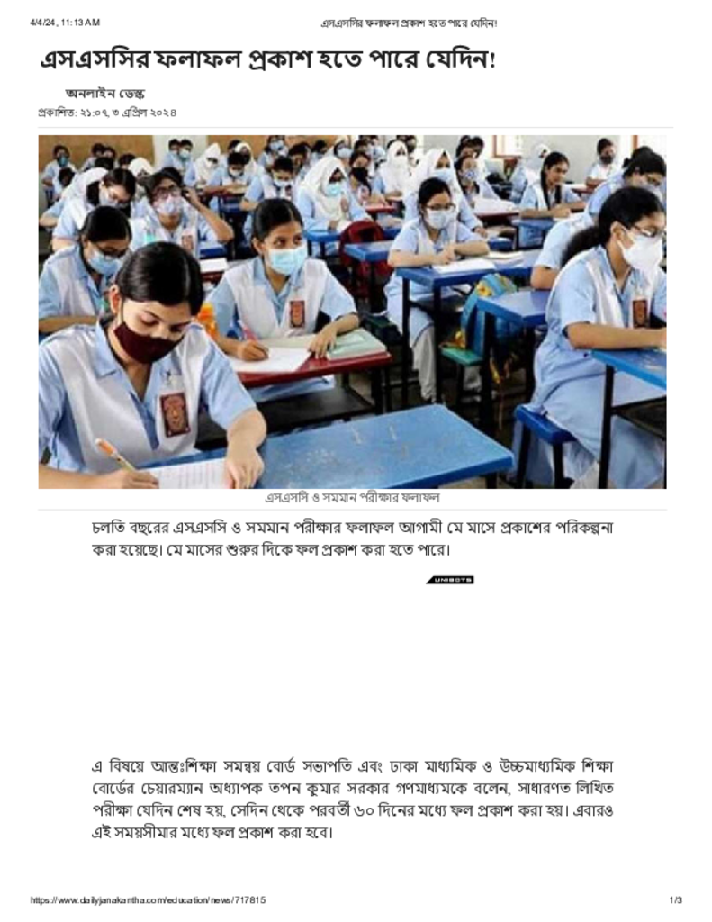 এসএসসির ফলাফল প্রকাশ হতে পারে যেদিন! Published on 03 April 2024 Newspaper দৈনিক জনকণ্ঠ Category Public Examination Public Examination SSC Download