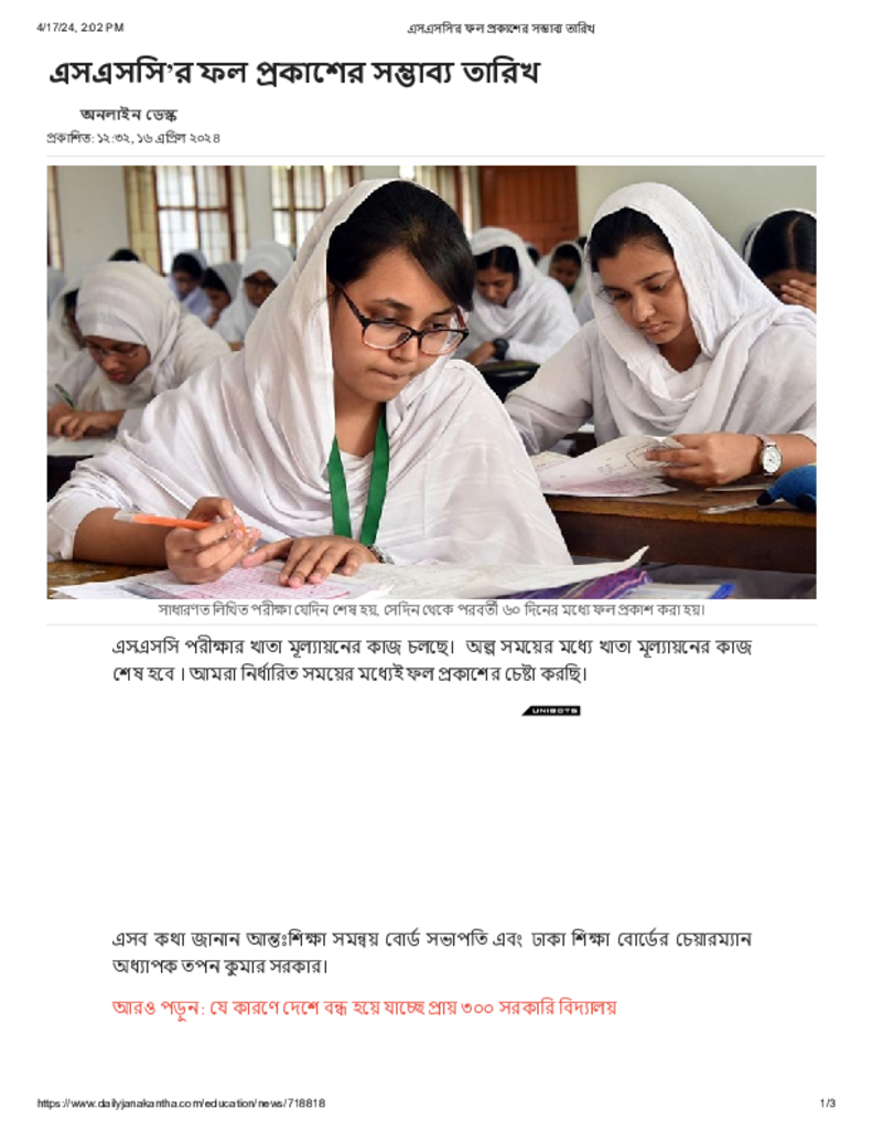 এসএসসি’র ফল প্রকাশের সম্ভাব্য তারিখ Published on 16 April 2024 Newspaper দৈনিক জনকণ্ঠ Category Public Examination Public Examination SSC Download