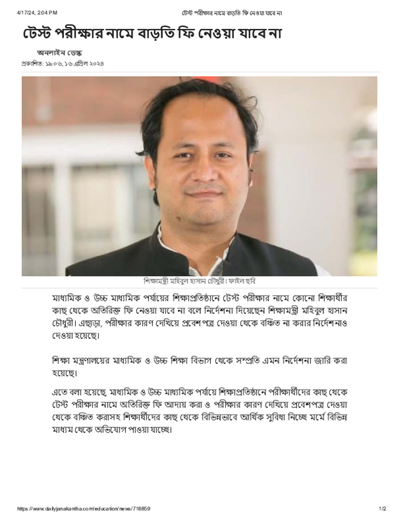 টেস্ট পরীক্ষার নামে বাড়তি ফি নেওয়া যাবে না Published on 16 April 2024 Newspaper দৈনিক জনকণ্ঠ Category Educational Ministry / Departments Public Examination SSC Download