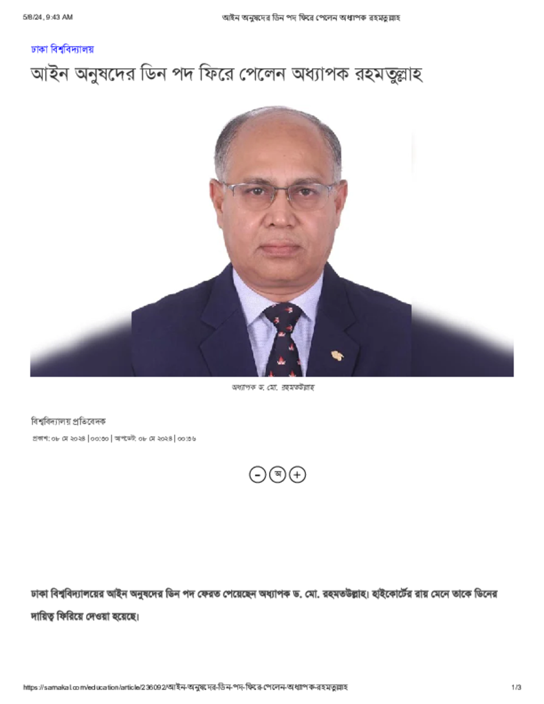 আইন অনুষদের ডিন পদ ফিরে পেলেন অধ্যাপক রহমতুল্লাহ.pdf Published on 08 May 2024 Newspaper দৈনিক সংবাদ Category Others General Education Higher Education Public Download