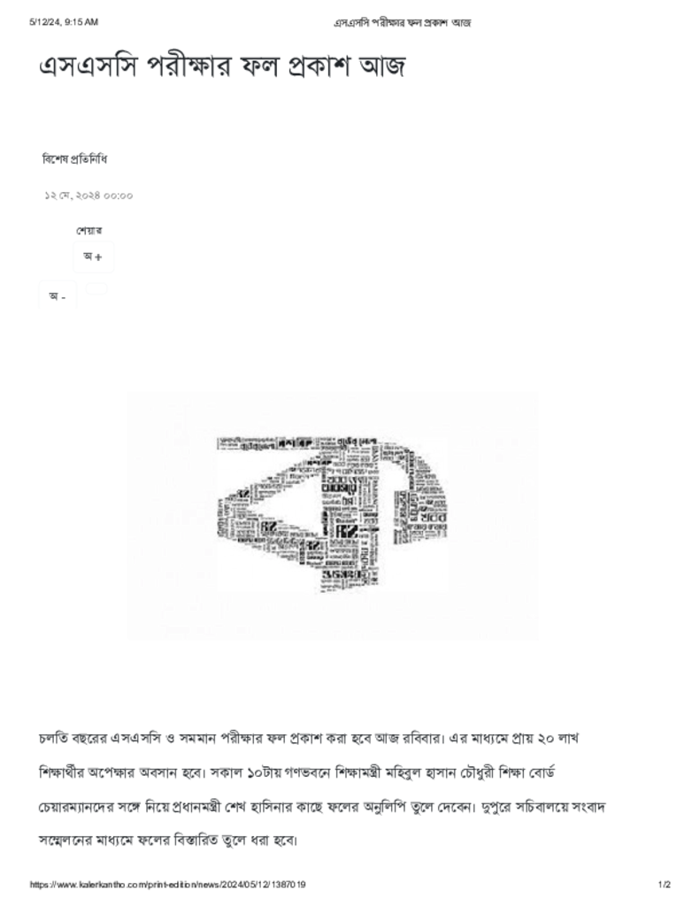 এসএসসি পরীক্ষার ফল প্রকাশ আজ.pdf Published on 12 May 2024 Newspaper দৈনিক কালের কন্ঠ Category Public Examination Public Examination SSC Download