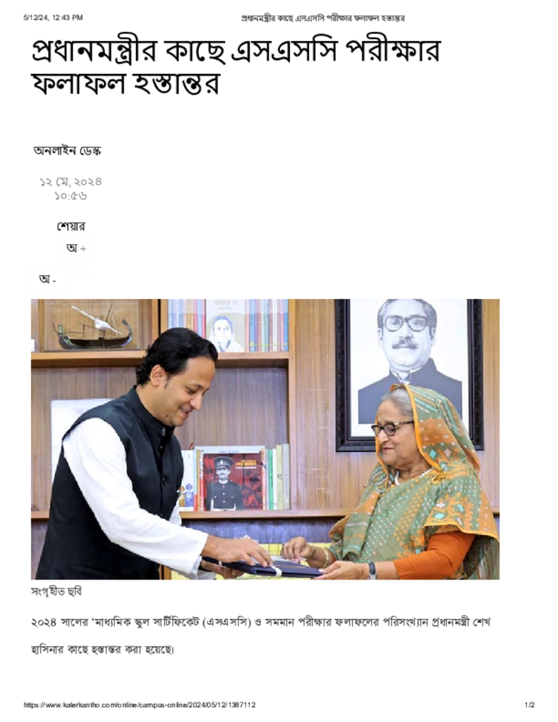 প্রধানমন্ত্রীর কাছে এসএসসি পরীক্ষার ফলাফল হস্তান্তর.pdf Published on 12 May 2024 Newspaper দৈনিক কালের কন্ঠ Category Educational Ministry / Departments Public Examination SSC Download
