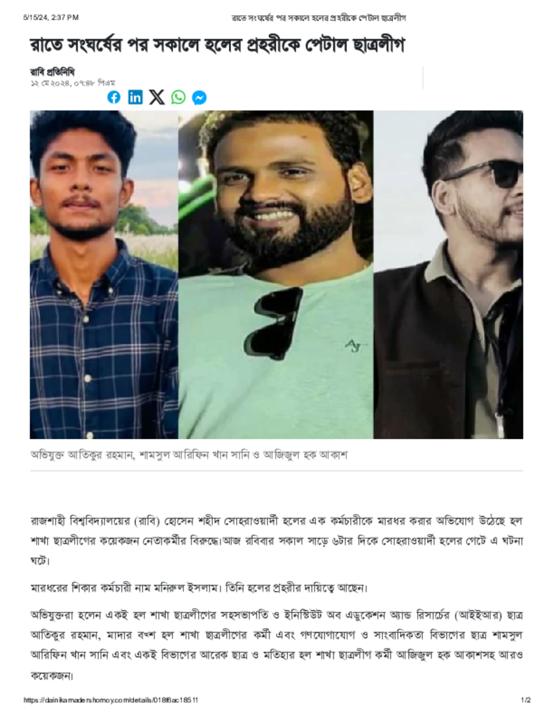 রাতে সংঘর্ষের পর সকালে হলের প্রহরীকে পেটাল ছাত্রলীগ.pdf Published on 12 May 2024 Newspaper দৈনিক আমাদের সময় Category Campus Terrorism General Education Download