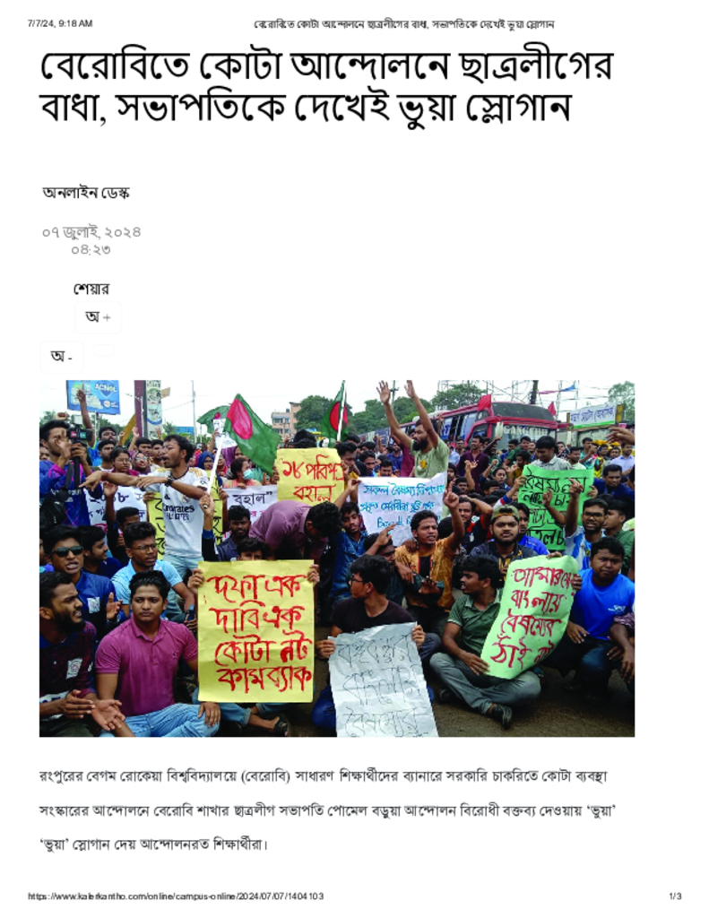 বেরোবিতে কোটা আন্দোলনে ছাত্রলীগের বাধা, সভাপতিকে দেখেই ভুয়া স্লোগান.pdf Published on 07 July 2024 Newspaper দৈনিক কালের কন্ঠ Category Others General Education Higher Education Public Download