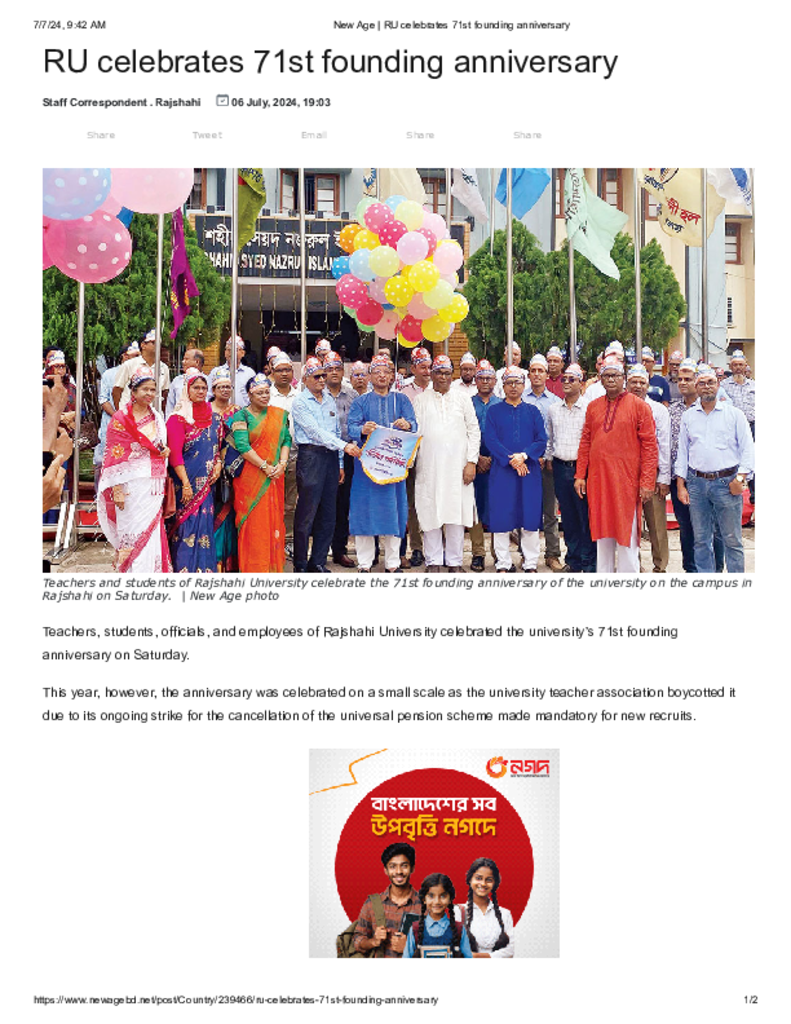 New Age _ RU celebrates 71st founding anniversary.pdf Published on 06 July 2024 Newspaper New Age Category General Education General Education Higher Education Public Download