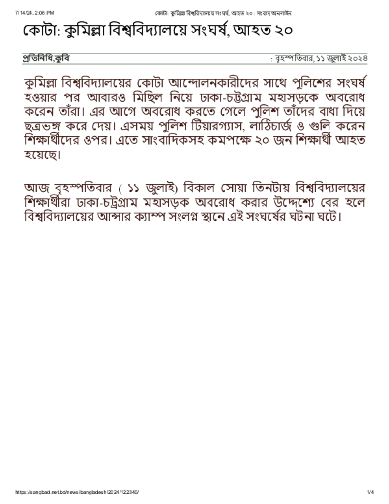 কোটা_ কুমিল্লা বিশ্ববিদ্যালয়ে সংঘর্ষ, আহত ২০ _ সংবাদ অনলাইন.pdf Published on 11 July 2024 Newspaper দৈনিক সংবাদ Category Campus Terrorism General Education Download