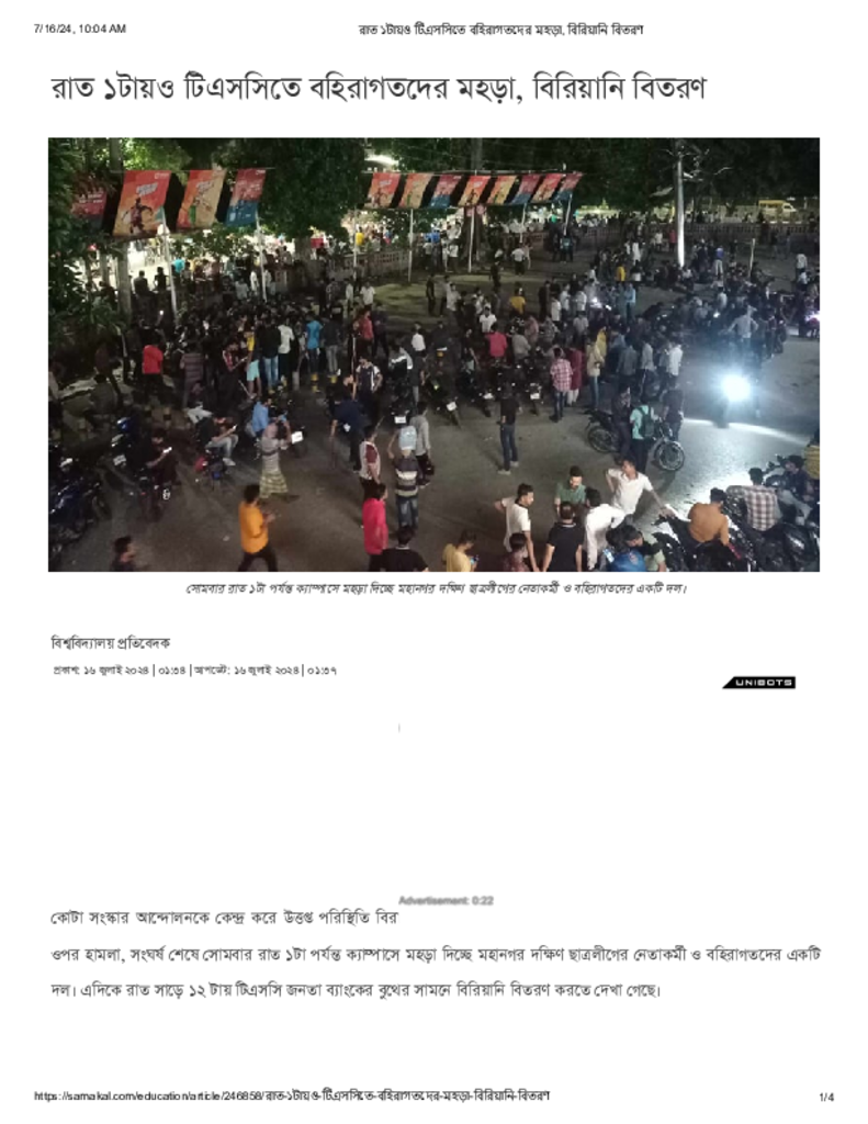 রাত ১টায়ও টিএসসিতে বহিরাগতদের মহড়া, বিরিয়ানি বিতরণ.pdf Published on 16 July 2024 Newspaper দৈনিক সমকাল Category Campus Terrorism Download