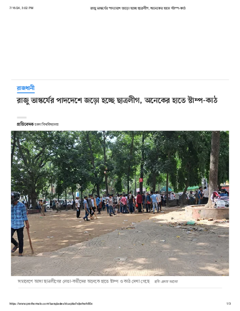 রাজু ভাস্কর্যের পাদদেশে জড়ো হচ্ছে ছাত্রলীগ, অনেকের হাতে স্টাম্প-কাঠ.pdf Published on 16 July 2024 Newspaper দৈনিক প্রথম আলো Category Campus Terrorism Download
