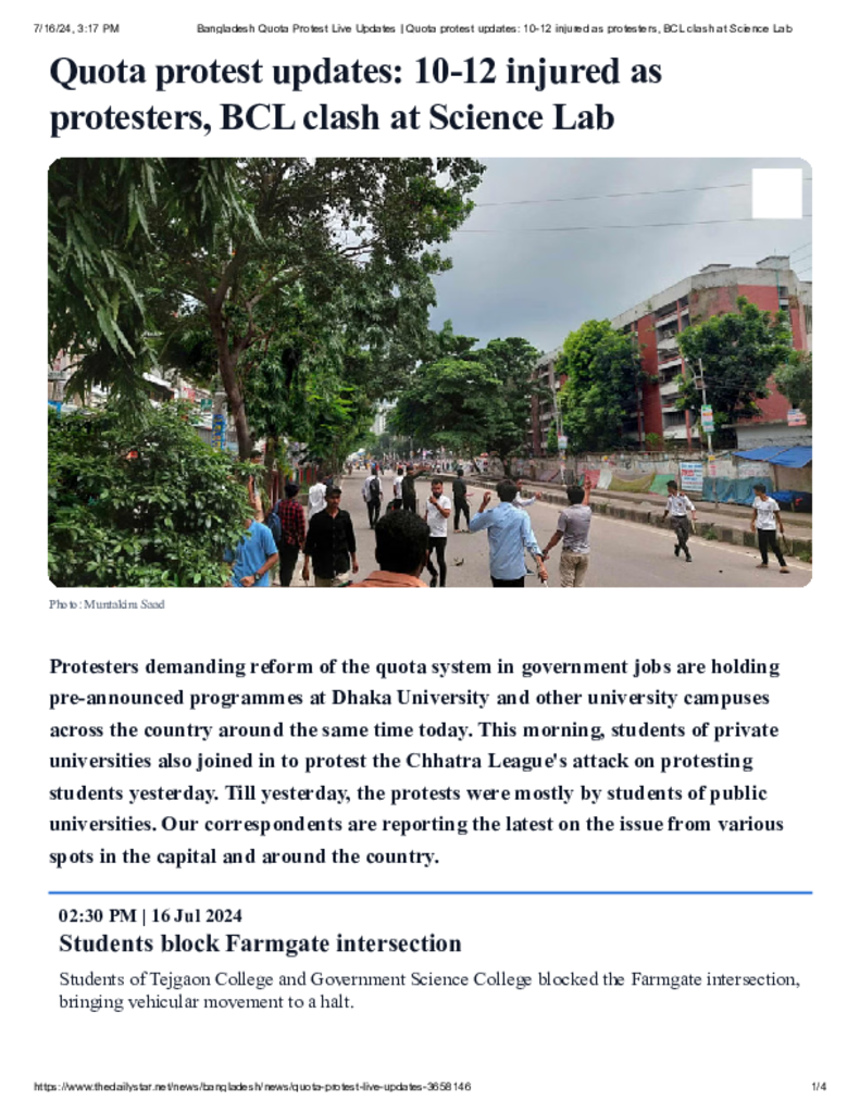 10-12 injured as protesters, BCL clash at Science Lab.pdf Published on 16 July 2024 Newspaper The Daily Star Category Campus Terrorism Download