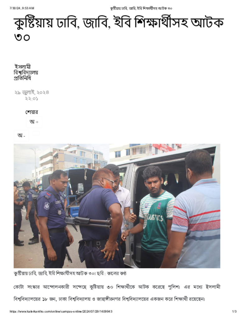কুষ্টিয়ায় ঢাবি, জাবি, ইবি শিক্ষার্থীসহ আটক ৩০.pdf Published on 29 July 2024 Newspaper দৈনিক কালের কন্ঠ Category Campus Terrorism General Education Download