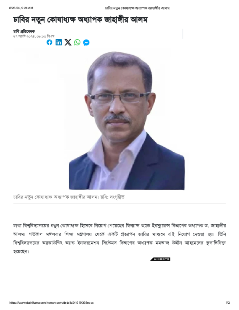 ঢাবির নতুন কোষাধ্যক্ষ অধ্যাপক জাহাঙ্গীর আলম.pdf Published on 27 August 2024 Newspaper দৈনিক আমাদের সময় Category General Education General Education Higher Education Public Download