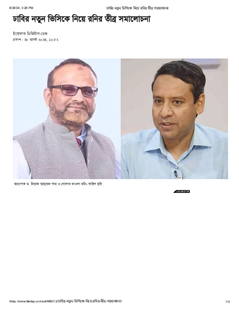 ঢাবির নতুন ভিসিকে নিয়ে রনির তীব্র সমালোচনা.pdf Published on 28 August 2024 Newspaper দৈনিক ইত্তেফাক Category Others General Education Higher Education Public Download