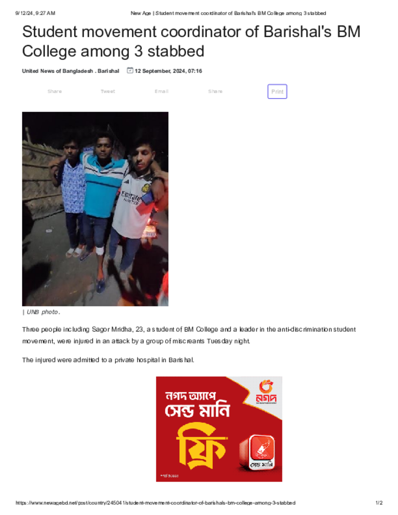 New Age _ Student movement coordinator of Barishal's BM College among 3 stabbed.pdf Published on 12 September 2024 Newspaper New Age Category Campus Terrorism General Education Download