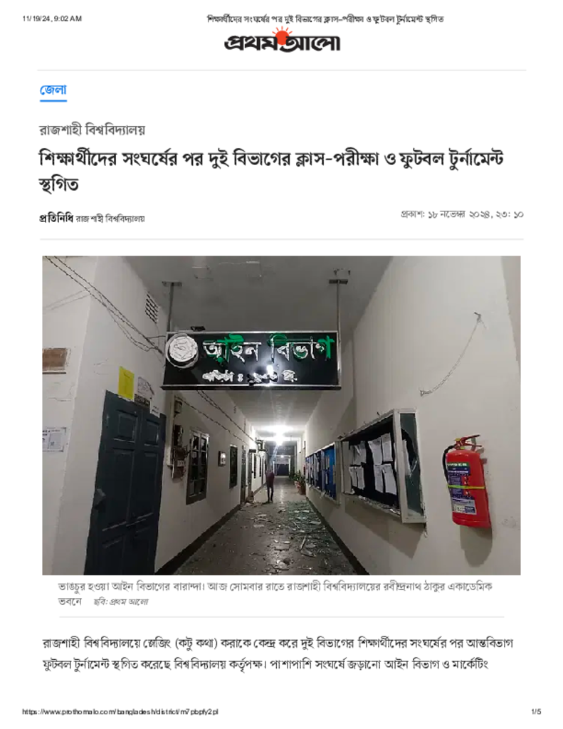 শিক্ষার্থীদের সংঘর্ষের পর দুই বিভাগের ক্লাস–পরীক্ষা ও ফুটবল টুর্নামেন্ট স্থগিত.pdf Published on 18 November 2024 Newspaper দৈনিক প্রথম আলো Category Campus Terrorism General Education Download
