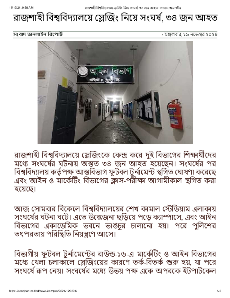 রাজশাহী বিশ্ববিদ্যালয়ে স্লেজিং নিয়ে সংঘর্ষ, ৩৪ জন আহত _ সংবাদ অনলাইন.pdf Published on 19 November 2024 Newspaper দৈনিক সংবাদ Category Campus Terrorism General Education Download