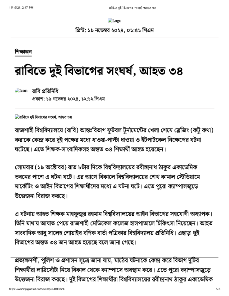রাবিতে দুই বিভাগের সংঘর্ষ, আহত ৩৪.pdf Published on 19 November 2024 Newspaper দৈনিক যুগান্তর Category Campus Terrorism General Education Download