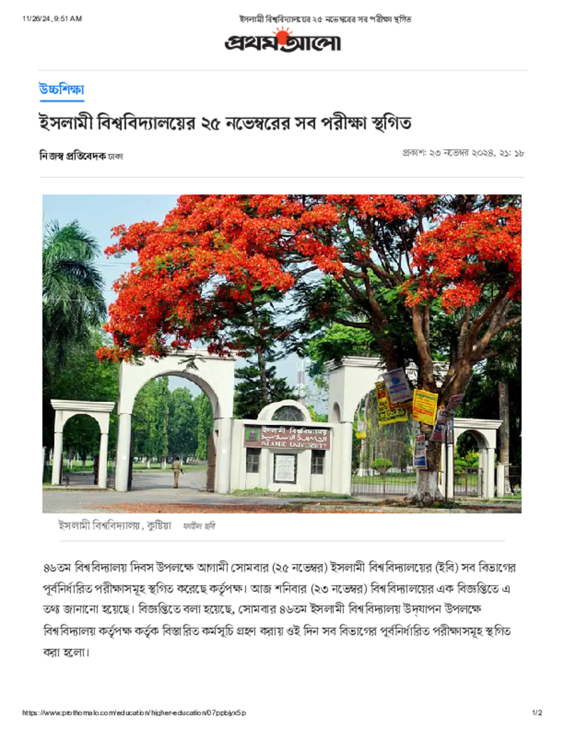 ইসলামী বিশ্ববিদ্যালয়ের ২৫ নভেম্বরের সব পরীক্ষা স্থগিত.pdf Published on 23 November 2024 Newspaper দৈনিক প্রথম আলো Category General Education General Education Download