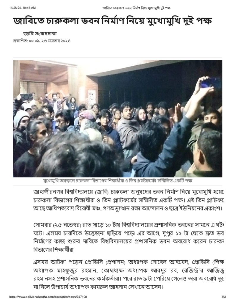জাবিতে চারুকলা ভবন নির্মাণ নিয়ে মুখোমুখি দুই পক্ষ.pdf Published on 26 November 2024 Newspaper দৈনিক জনকণ্ঠ Category Campus Terrorism General Education Download
