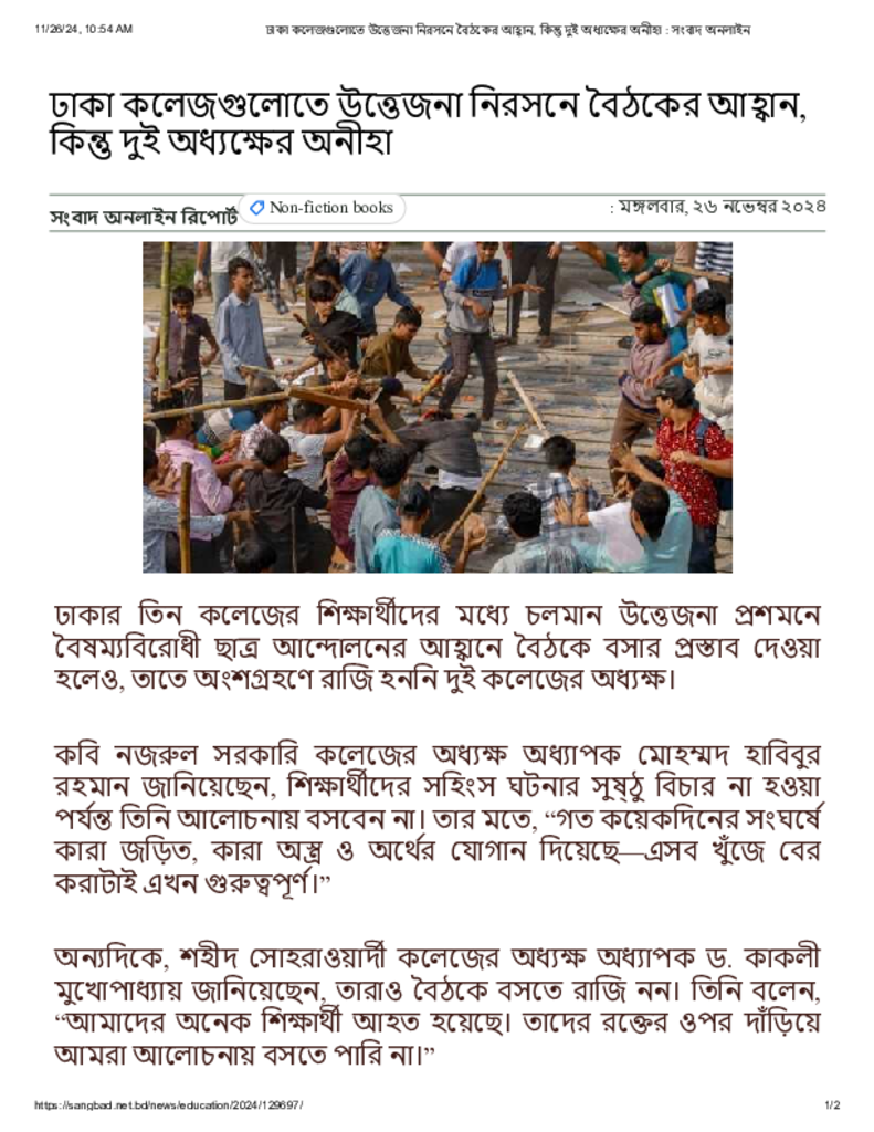 ঢাকা কলেজগুলোতে উত্তেজনা নিরসনে বৈঠকের আহ্বান, কিন্তু দুই অধ্যক্ষের অনীহা _ সংবাদ অনলাইন.pdf Published on 26 November 2024 Newspaper দৈনিক সংবাদ Category Campus Terrorism General Education Download