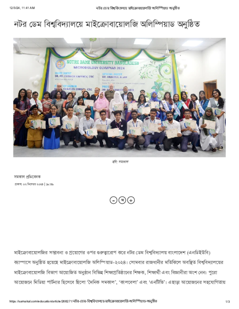 নটর ডেম বিশ্ববিদ্যালয়ে মাইক্রোবায়োলজি অলিম্পিয়াড অনুষ্ঠিত.pdf Published on 02 December 2024 Newspaper দৈনিক সমকাল Category General Education General Education Download