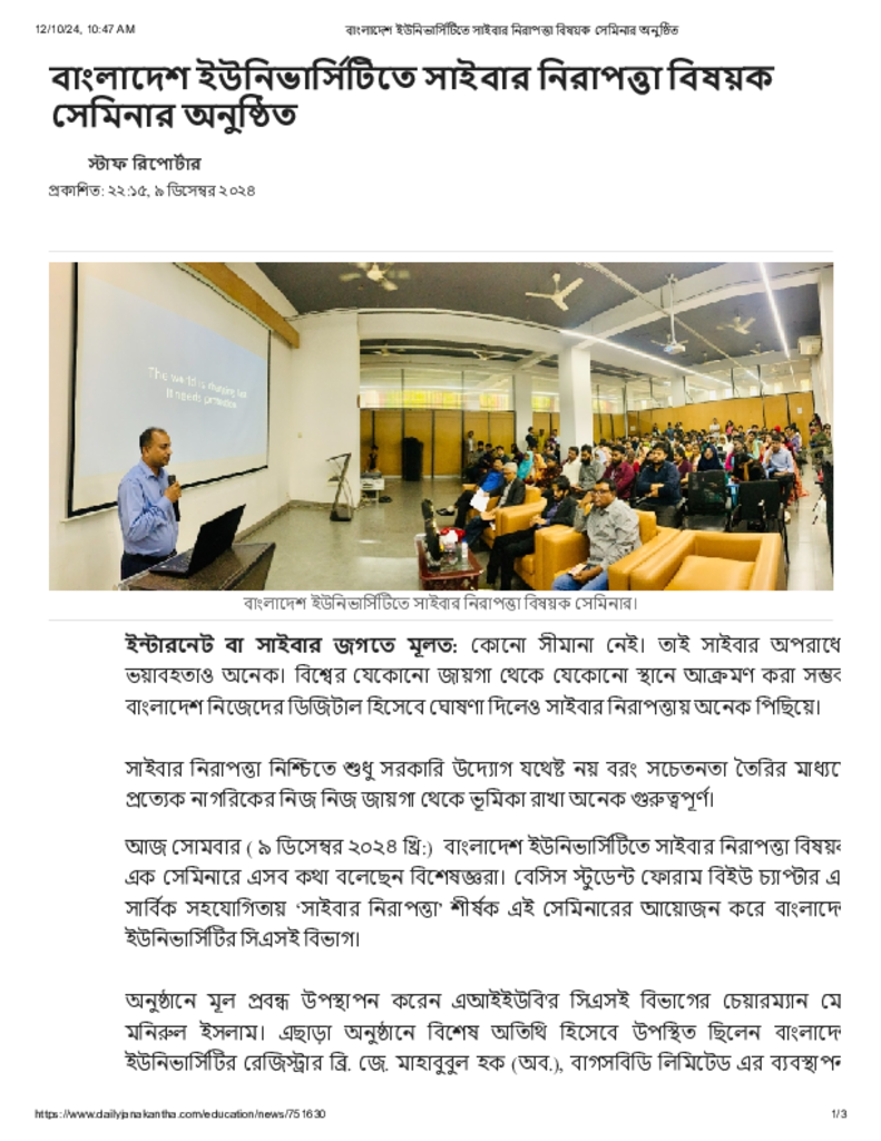 বাংলাদেশ ইউনিভার্সিটিতে সাইবার নিরাপত্তা বিষয়ক সেমিনার অনুষ্ঠিত.pdf Published on 09 December 2024 Newspaper দৈনিক আমাদের সময় Category General Education General Education Download