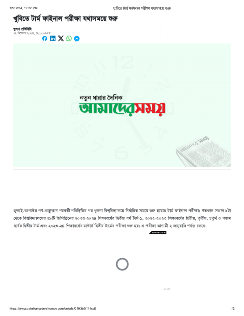খুবিতে টার্ম ফাইনাল পরীক্ষা যথাসময়ে শুরু.pdf Published on 12 December 2024 Newspaper দৈনিক আমাদের সময় Category General Education General Education Download