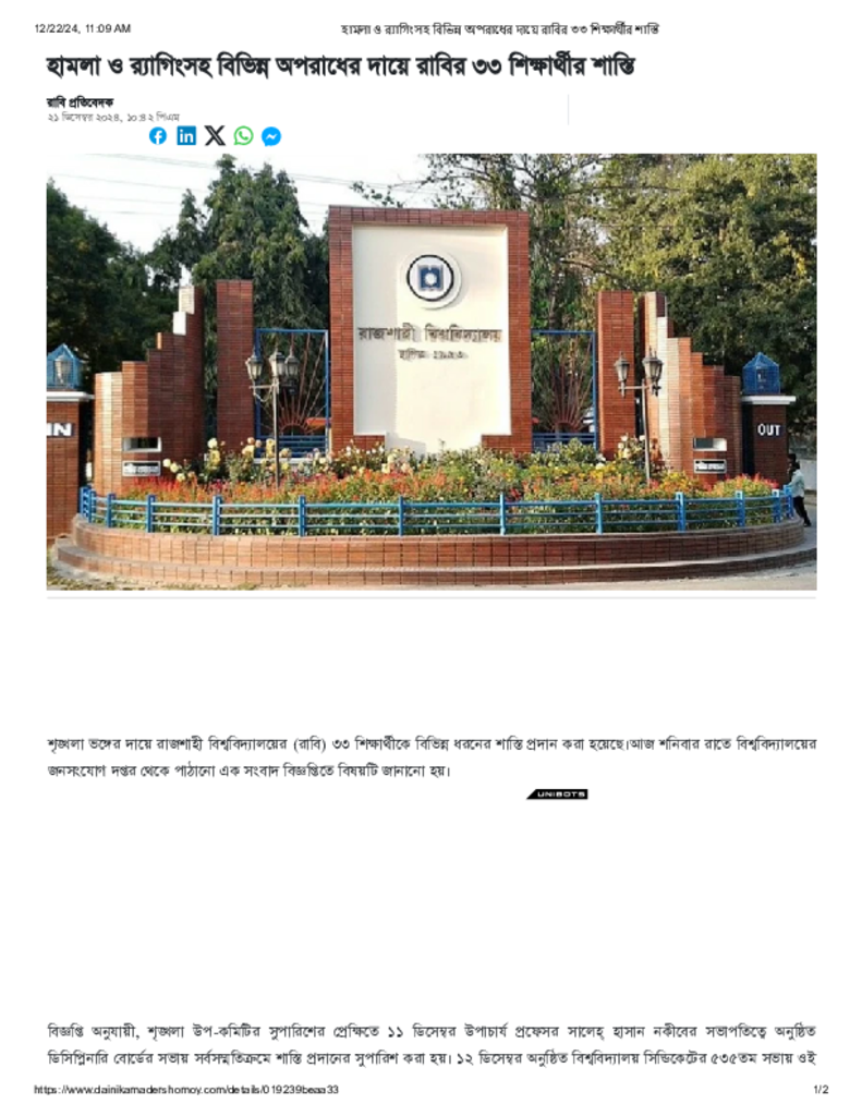 হামলা ও র_্যাগিংসহ বিভিন্ন অপরাধের দায়ে রাবির ৩৩ শিক্ষার্থীর শাস্তি.pdf Published on 21 December 2024 Newspaper দৈনিক আমাদের সময় Category Campus Terrorism General Education Download