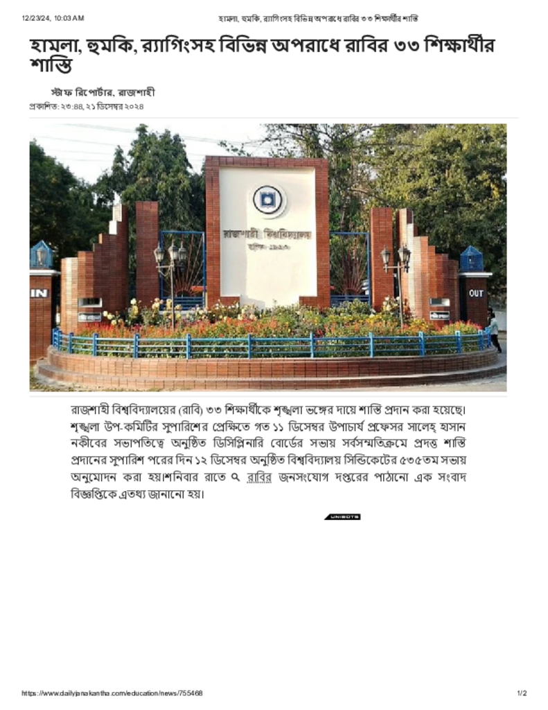 হামলা, হুমকি, র_্যাগিংসহ বিভিন্ন অপরাধে রাবির ৩৩ শিক্ষার্থীর শাস্তি.pdf Published on 21 December 2024 Newspaper দৈনিক জনকণ্ঠ Category Campus Terrorism General Education Download