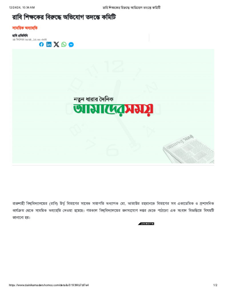 রাবি শিক্ষকের বিরুদ্ধে অভিযোগ তদন্তে কমিটি.pdf Published on 24 December 2024 Newspaper দৈনিক আমাদের সময় Category General Education General Education Download