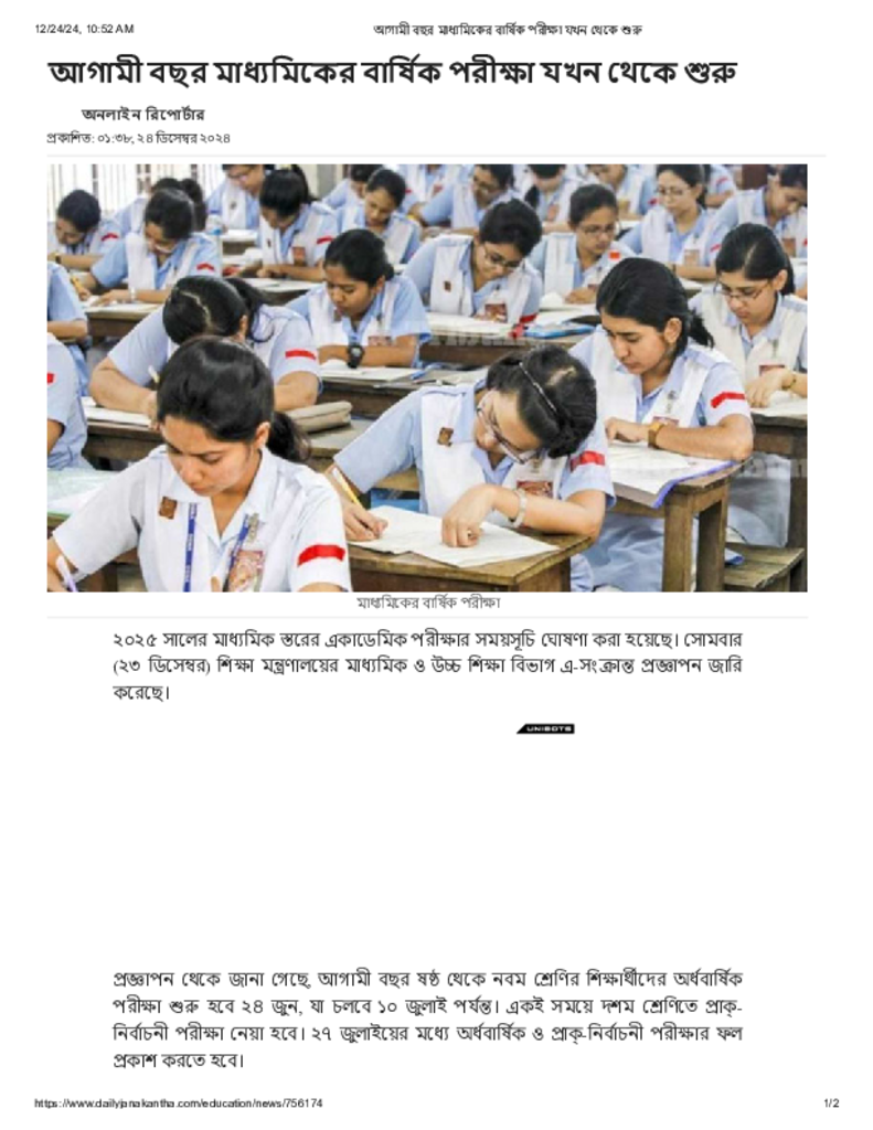 আগামী বছর মাধ্যমিকের বার্ষিক পরীক্ষা যখন থেকে শুরু.pdf Published on 24 December 2024 Newspaper দৈনিক জনকণ্ঠ Category General Education General Education Download