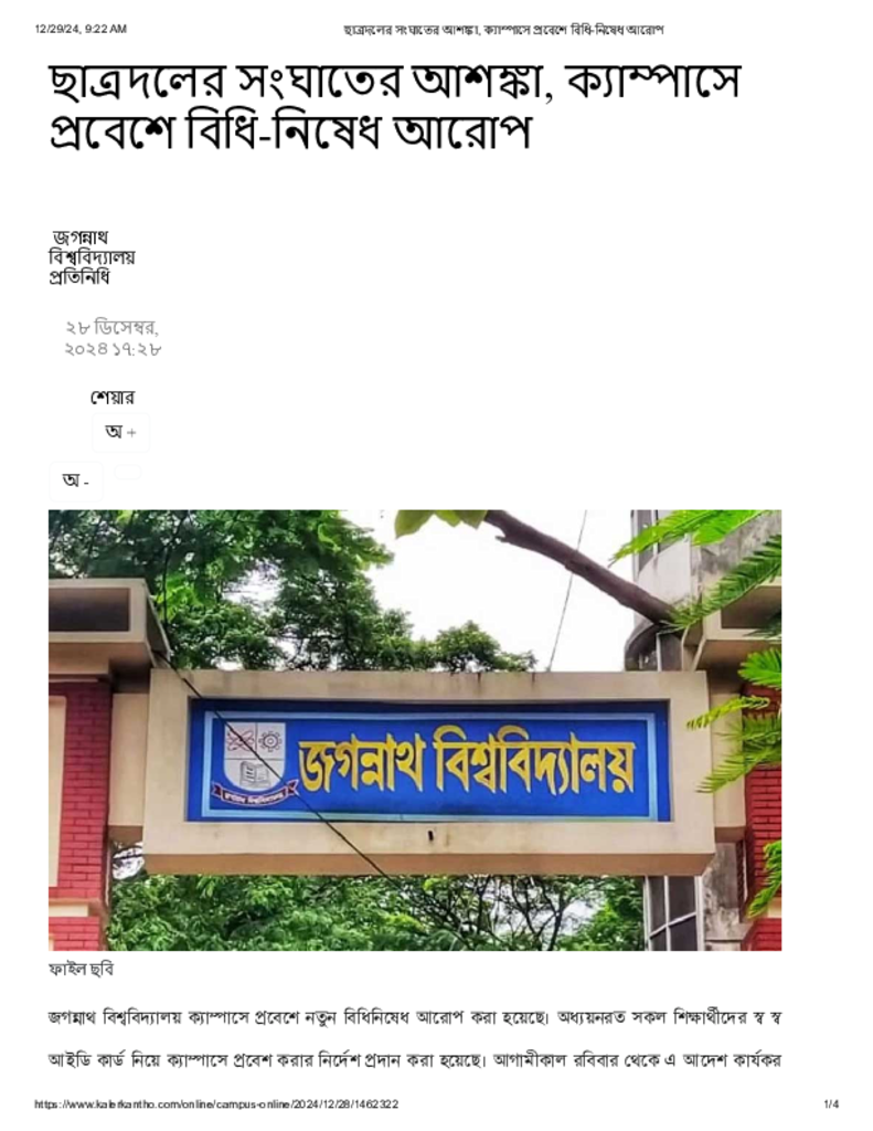 ছাত্রদলের সংঘাতের আশঙ্কা, ক্যাম্পাসে প্রবেশে বিধি-নিষেধ আরোপ.pdf Published on 28 December 2024 Newspaper দৈনিক কালের কন্ঠ Category Campus Terrorism General Education Download